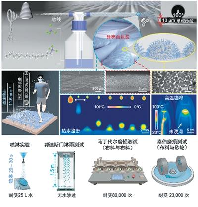 军工资源网 2026年04月15日MARS超疏水技术衣物示意。 MARS超疏水处理工艺及性能。 受访者供图 咖啡一洒,衣物浸透;暴雨突至,湿冷缠身……从日常服饰到户外装备,再到工业防护,人们对“既防水、又耐用、还环保”的织物材料需求正变得日益迫切。 近日,中国科学院理化技术研究所仿生智能界面科学中心研究团队受自然界弹尾虫启发,开发出一种共价键构筑的MARS(分子组装耐用超疏水壳)技术,通过“一步法”实现无氟超疏水织物的制备,使纺织品在极端环境下仍能保持稳定性能。 来自弹尾虫的灵感 “传统防水面料长期面临着两大难题,环保压力与耐磨性差。”中国科学院理化技术研究所研究员董智超说,当前织物主流防水技术大多依赖两类路径:一是含氟类物质(如PFOA、PFAS),二是纳米颗粒涂层。前者在日常使用过程中会对人类的健康以及生态环境造成潜在威胁,目前正在逐步禁用;而后者容易在摩擦、洗涤过程中脱落,导致性能迅速衰减。 “我们希望能摆脱对含氟化学物质和离散纳米颗粒的依赖,用最简单的方法构建稳健超疏水结构,从而真正解决耐久与环保无法兼顾的行业痛点。”董智超说,所谓“超疏水”,是指材料表面对水具有极强的排斥能力,水滴几乎无法铺展,而是迅速滚落。 这项技术的灵感,来自一种微小却强悍的生物,弹尾虫。 在潮湿、泥泞、富含摩擦的土壤环境中,弹尾虫经过4亿年进化,形成了由微型蘑菇状结构与纳米级脊线构成的特殊表皮。表皮就像天然防沾湿盔甲,使其具备极强的拒水能力,即使在水面也能保持干燥,甚至完成跳跃。 科研人员受到启发,如果能在织物纤维表面构建类似的微纳结构,并赋予其足够的稳定性,是否就能实现既耐用又高效的防水效果? 开发出一步法技术 围绕这一思路,研究团队开发出了MARS(分子组装耐用超疏水壳)一步法技术。 与传统涂层技术相比,MARS技术的核心差异在于其构建方式。 据研究人员介绍,传统的喷洒或浸渍工艺,就像是在布料表面刷了一层含有纳米颗粒或含氟类物质的涂料。这种涂层仅仅附着在表面,受到摩擦就容易脱落。而MARS技术的区别在于,它是在纤维表面直接构建了有序的、无氟的二氧化硅壳层。这层壳不是简单物理堆叠的,而是通过一步法原位反应,在单根纱线纤维表面化学生长出来并紧密排列的。 MARS技术在单根纤维表面形成“共价键合”的二氧化硅壳层,这不是简单附着,而是通过化学键与纤维牢固结合,真正成为材料本体的一部分。这种“共价键合”的特性,使壳层具备极高的稳定性。在此基础上,通过引入无氟烷基链降低表面能,并结合仿生微结构,实现持久的超疏水性能。 在实验验证中,MARS织物展现出远超传统材料的稳定性。董智超说:“例如水滴以高达11.6米/秒的极高速度撞击,面料依然保持稳定的防水性;在2.4米/秒的连续水滴撞击8万次后,面料超疏水性能依旧不减。经过20次标准洗涤后,其防水等级仍能保持在4.5级。由于壳层是通过‘共价键合’的,它在机械磨损和复杂的酸碱环境下,展现出了超出传统涂层的坚固。” 除此之外,MARS织物处理是在纤维阶段完成的,它可直接应用于天然和合成纤维,在不影响织物原有透气性、柔韧性和机械强度的前提下,实现持久的无氟防水性能,弥补了日常服饰及高频洗涤场景中对柔软透气与耐久防水的双重需求。 新一代防水织物 “MARS技术的应用范围相当广泛。”董智超说,“由于它可以在不牺牲织物透气性和柔韧性的前提下,为天然和合成纤维赋予持久的超疏水性能,因此不仅适用于冲锋衣、帐篷等传统户外装备,也同样适用于需要抵御血液和体液飞溅的医用防护服,以及具备耐脏污、自清洁特性的家居内饰等领域。” 此外,MARS涂层可耐受强烈磨损、高速水流冲击、蒸汽暴露及极端温度循环,在柔性可穿戴设备、航空航天防结冰等高精尖领域,它同样拥有较大应用潜力。 在环保约束不断强化、性能需求持续提升的今天,这种“一步成型”的无氟超疏水织物,不仅回应了现实挑战,也为未来防水材料的发展提供了新技术路径。