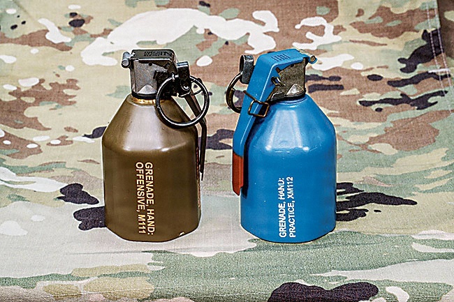 M111手榴弹(左一)和M112手榴弹(训练型号)。